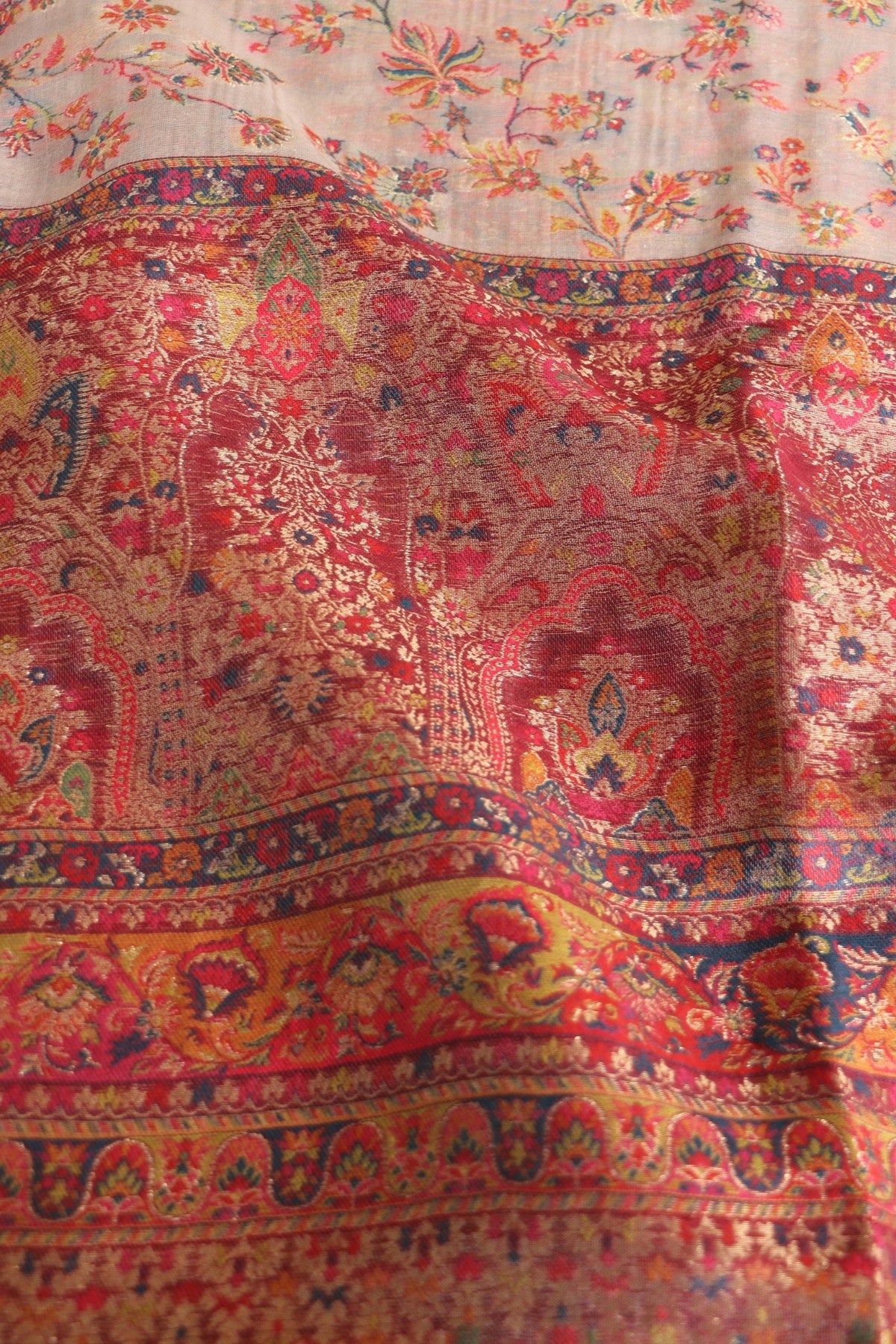 Beige Kani Organza Silk Suit is a beautiful fusion of elegance and tradition. Crafted from luxurious Organza silk fabric, this suit is adorned with intricate Kani weaving featuring classic motifs like paisleys and florals. The soft beige hue offers a subtle backdrop, while the lightweight fabric ensures a graceful drape, making it ideal for festive occasions or special events. The set is accompanied with plain bottom fabric and a dupatta with similar motifs. Complete your look with this timeless piece, blending modern sophistication with the rich heritage of Kashmiri artistry.